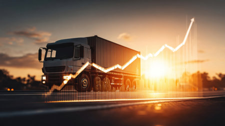 A truck travels along a highway at sunset, with a rising graph overlay symbolizing growth and success in the logistics and transportation sector.