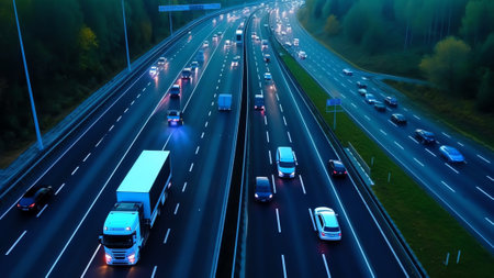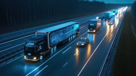 A drone view of autonomous trucks on a futuristic highway, with glowing blue holographic data streams tracking their routes