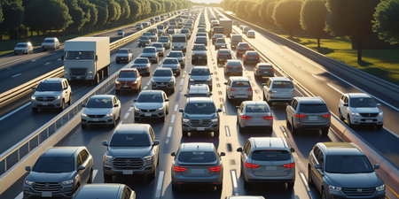 A traffic jam on a major road, with rows of cars bumper to bumper, highlighting the challenges of congestion