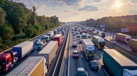 Wide-angle view of a busy highway with multiple freight trucks and cargo vehicles driving, showcasing the busy nature of freight transport with copy space.