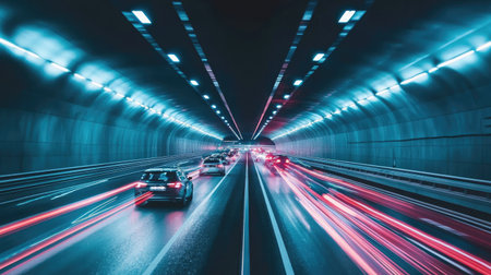 Cars on a highway going through a long modern tunnel (motion blurred image; color toned image)