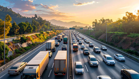 A long highway filled with cars is seen at dawn, under an orange sky. The image features many vehicles traveling in opposite directions. The overall aesthetic is clean and modern, highlighting the structure and potential for transport-related projects. The photograph could be used for various commercial or editorial needs.