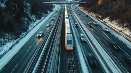 A high-speed train races alongside a busy highway during winter, showcasing the thrill of modern transportation in a dynamic urban landscape.