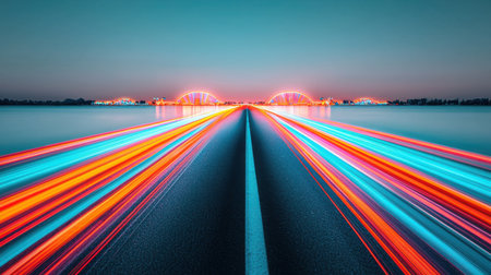 Stunning long exposure capture of vibrant light trails on an empty road with a city skyline at dusk, creating a dynamic and modern atmosphere.