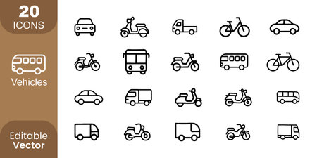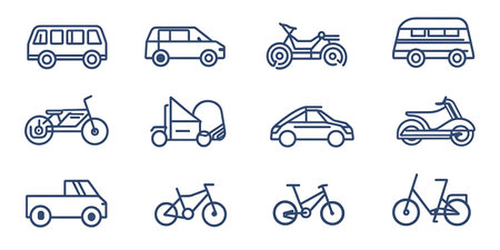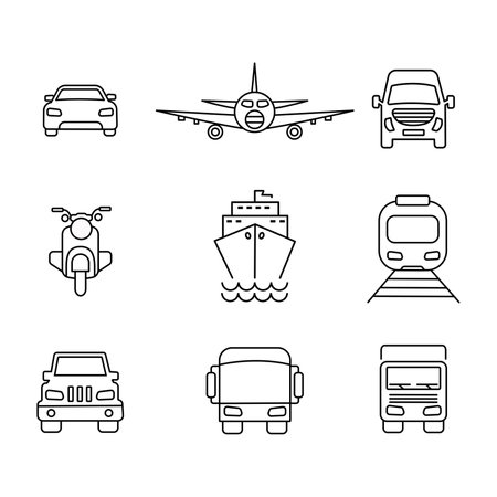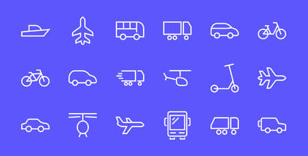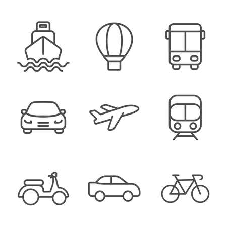 Transport line icon. Minimal vector illustration with thin outline icons as car, bus, train, bicycle, truck, motorcycle, cargo shipping, lorry and other vehicle. Editable Stroke