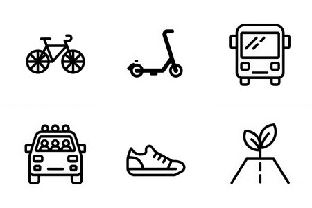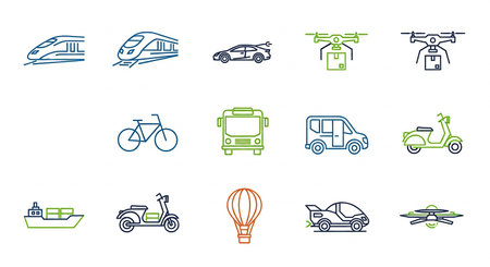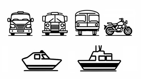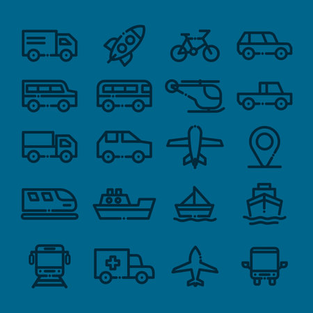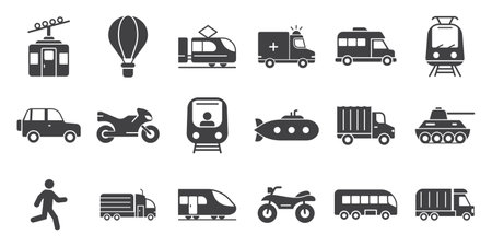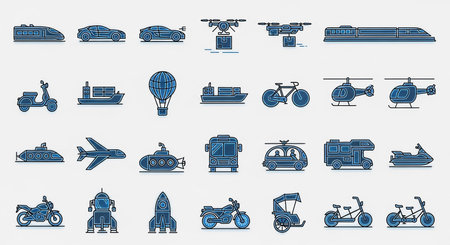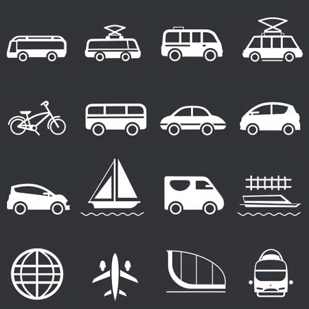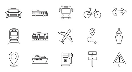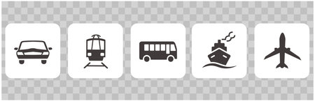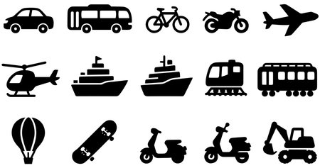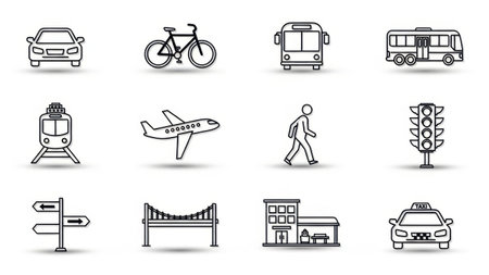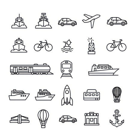 This image features a collection of different modes of transportation, including boats, cars, airplanes, bicycles, trains, and more. Each icon represents a unique way of traveling, showcasing the diversity of transportation options available.