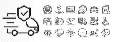 Plane, Food delivery and Bicycle helmet line icons for web app. Glare of light effect. Message icon. Pack of Disability, Hold box, Diesel canister pictogram icons. Vector