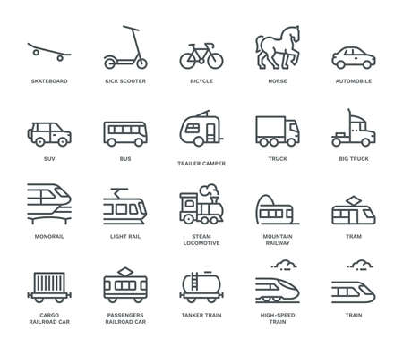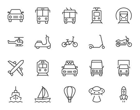 Set of public transport related vector line icons. Contains icons such as bus, bike, suitcase, car, scooter, truck, transport, trolley bus, sailboat, motor boat, plane and much more. Editable stroke