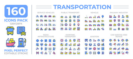 Transportation colorful icons set collectio. Road service. System of passengers and cargoes carrying mega pack of flat line symbols, pixel perfect. Isolated vector illustrations. Editable stroke