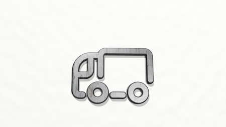 DELIVERY TRUCK made by 3D illustration of a shiny metallic sculpture on a wall with light background. business and box