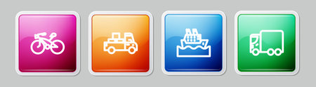 Set line Bicycle, Delivery truck, Cruise ship and cargo. Colorful square button. Vector.