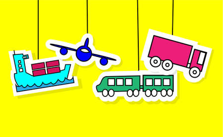 Logistics icons of airplane, vessel, train and truck with yellow background