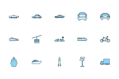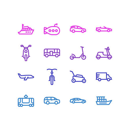 illustration of 16 vehicle icons line style. Editable set of motorbike, bicycle, vessel and other icon elements.