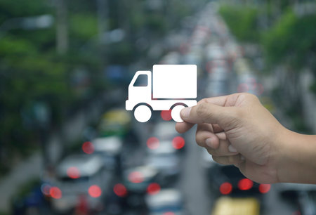 Hand holding delivery truck flat icon in fingers over blur of rush hour with cars and road in city, Business transportation service concept