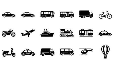 Model Version: pro | Model Category: General | Prompt: Collection of black silhouette icons, each representing a different mode of transportation, arranged in a clean, evenly spaced grid layout on a plain white background. Icons are simplified, flat, and highly recognizable, including cars, buses, bicycles, motorcycles, airplanes, helicopters, boats, ships, trains, hot air balloons, skateboards, scooters, and construction vehicles. All icons feature uniform weight, proportion, consistent line thickness, and minimal detail for clarity. Modern, vector-based aesthetic, professional design quality, sharp focus. | Enhanced Prompt: Collection of black silhouette icons, each representing a different mode of transportation, arranged in a clean, evenly spaced grid layout on a plain white background. The icons are simplified, flat, and highly recognizable, including: cars, buses, bicycles, motorcycles, airplanes, helicopters, boats, ships, trains, hot air balloons, skateboards, scooters, and construction vehicles. All icons feature uniform weight, proportion, consistent line thickness, and minimal detail for clarity. Modern, vector-based aesthetic, professional design quality, sharp focus. Dominant colors are black and white. Composition is a perfect symmetrical grid. High contrast, clean lines, minimalist design, vector illustration, Ultra HD, 4K.