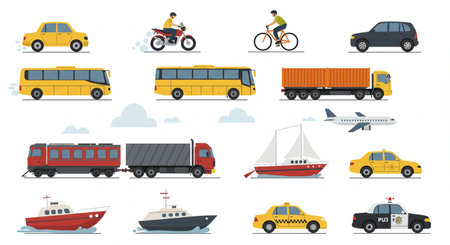 Cars, Trucks, Buses, Motorcycles, Bicycles, Airplanes, Ships, Taxi, and Police Car Illustration Set