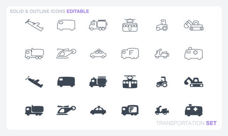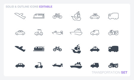 A vector file featuring solid and outline icon sets inspired by transportation themes.