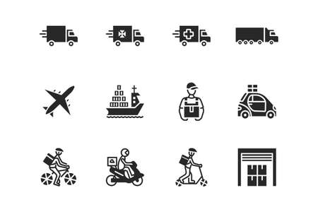 Transport company flat glyph icon set. Vector illustration food and delivery service silhouette. Transportation of cargo. Worldwide delivery