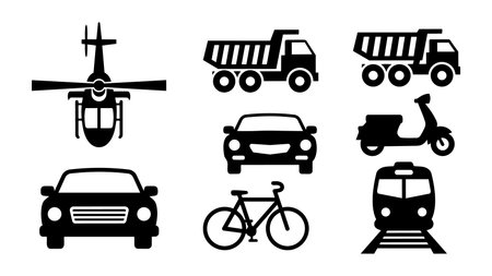 Collection of black silhouette vehicle icons including helicopter, dump truck, car, scooter, bicycle, and train on white background in simple vector graphic style, clean and minimal.