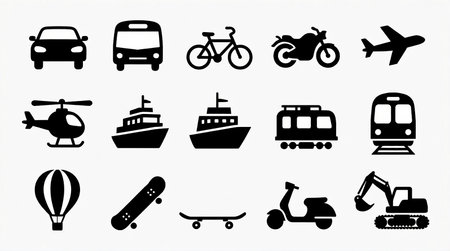 Model Version: pro | Model Category: General | Prompt: Collection of black silhouette icons, arranged in a clean, evenly spaced grid layout on a plain white background. Each icon represents a different mode of transportation, designed in a simplified, flat, and highly recognizable style. The set includes diverse vehicles such as cars, buses, bicycles, motorcycles, airplanes, helicopters, boats, ships, trains, hot air balloons, skateboards, scooters, and construction vehicles. All icons are uniform in weight and proportion, with consistent line thickness and minimal detail for clarity. Modern, vector-based aesthetic, suitable for educational materials, UI/UX design, or infographic use, professional quality. | Enhanced Prompt: A collection of black silhouette icons, arranged in a clean, evenly spaced grid layout on a plain white background. Each icon represents a different mode of transportation, designed in a simplified, flat, and highly recognizable style. The set includes diverse vehicles: cars, buses, bicycles, motorcycles, airplanes, helicopters, boats, ships, trains, hot air balloons, skateboards, scooters, and construction vehicles. All icons are uniform in weight and proportion, with consistent line thickness and minimal detail for clarity. Modern, vector-based aesthetic, suitable for educational materials, UI/UX design, or infographic use. The composition is perfectly symmetrical with precise alignment and consistent negative space between all elements. High contrast, sharp edges, minimalist design, professional quality, vector illustration, Ultra HD, 4K.