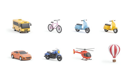 a collection of colorful toy vehicles and transportation models arranged on a white background. The set includes a yellow bus, a pink bicycle, two scooters (one blue and one yellow), an orange car, a blue motorcycle, a red helicopter, and a red and white hot air balloon. Each model is detailed and vibrant, making them visually appealing and educational or playful contexts.