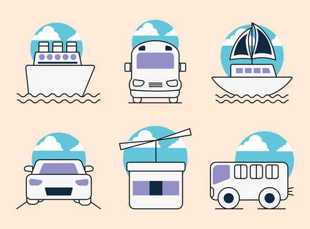 Vehicles line style icon set design, Transportation travel trip urban motor speed fast and driving theme Vector illustration