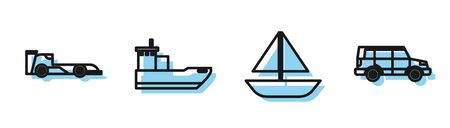 Set line Yacht sailboat or sailing ship, Formula race car, Cargo ship and Off road car icon. Vector