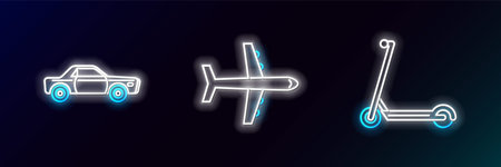 Set line Scooter, Sedan car and Plane icon. Glowing neon. Vector