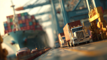 Modern Semi-Truck Cargo Transportation with Sunset at Port for Global Commerce