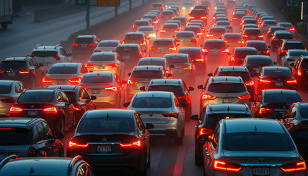 A vivid portrayal of an evening traffic jam showcasing a busy urban environment, with bright brake lights illuminating the cars and setting a dynamic evening scene.