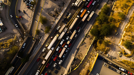 drone shot of cargo trucks on highway in a row, created with generative ai