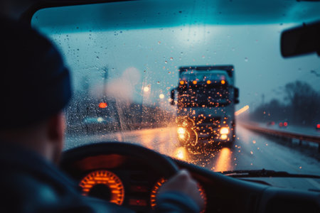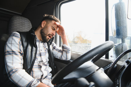 Truck driver feeling tired and stressed in the vehicle cabin, experiencing sleep deprivation, fatigue, and burnout on the road