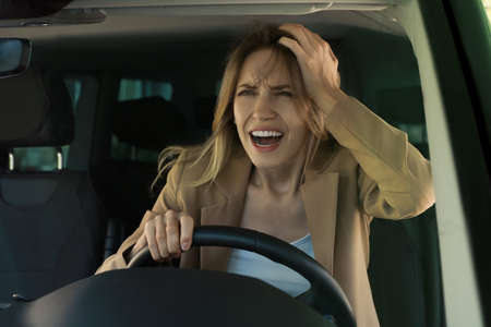 Stressed angry woman in driver's seat of modern car, view through windshield