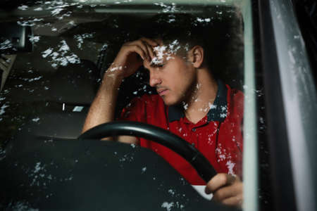 Stressed man in driver's seat of modern car, view through windshield