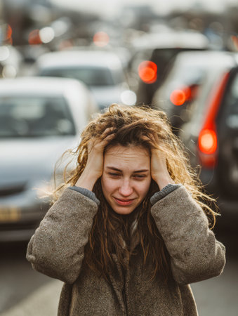 A young woman appears overwhelmed as she stands amidst a sea of vehicles, clutching her head in concern, embodying daily stress and the chaos of urban traffic.