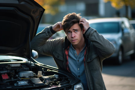 A man stands in shock before the open car hood, baffled by the unexpected vehicle breakdown