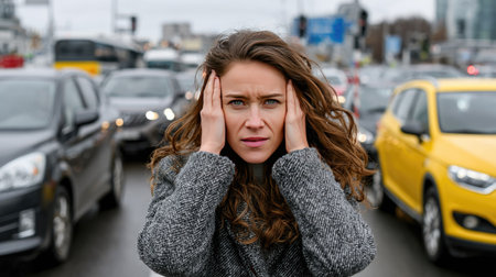 A young woman stands in the midst of heavy traffic, covering her ears with a distressed expression. The busy urban scene highlights her anxiety amidst the chaos.