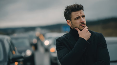 A thoughtful man in a black coat stands by a busy road, gazing into the distance. The overcast sky and surrounding traffic create a sense of introspection and urban life.