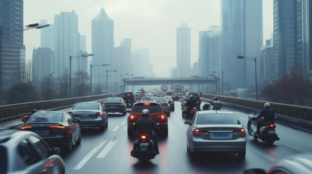 A bustling urban scene captures a traffic jam on a rainy day, featuring various vehicles including cars and motorcycles amidst a backdrop of towering skyscrapers.