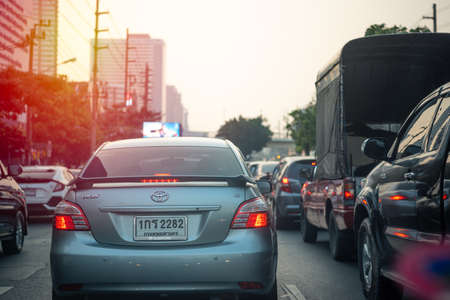 Bangkok, Thailand - January 17, 2020 : Cars on busy road in the Bangkok city, Thailand. Many cars use the street for transportation in rushhour with a traffic jam