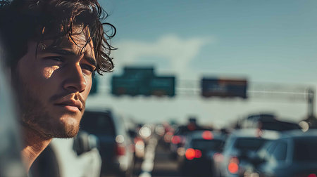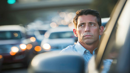 A man appears deep in thought while stuck in traffic, showcasing frustration and concern. Surrounding vehicles blur in the background, emphasizing the urban congestion.