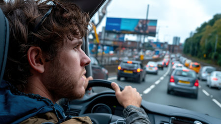 A young man appears lost in thought as he gazes out of a car window amidst a heavy traffic jam. The urban scene captures a moment of reflection in a busy life.