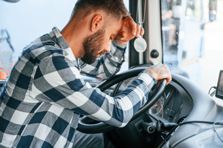 Young man with a beard, a professional driver, feeling tired and stressed while working in his truck cabin