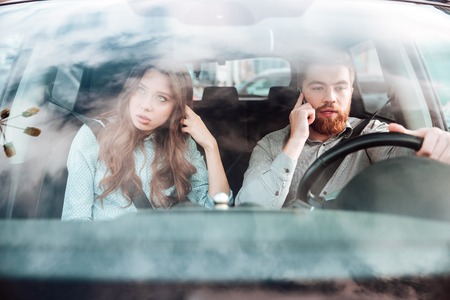 Pretty couple in car. man talking at phone. girl offened