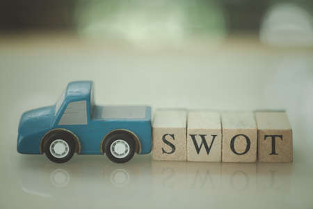 Swot analysis, strength, weakness, opportunity, and threat text on wood block with toy car. SWOT analysis concept
