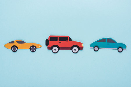 A row of several cars on a blue background. The concept of selling and buying cars.