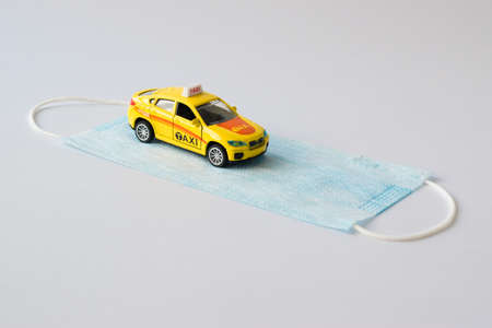 On a white background, a smartphone standing on a protective mask. There is a miniature taxi and antiseptic. Banner