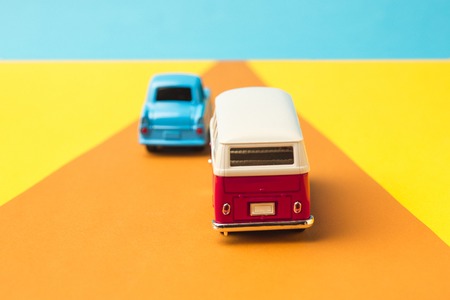 Car rental, trip, travel or weekend activity concept flat lay with yellow small toy cabriolet car on yellow background