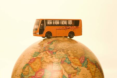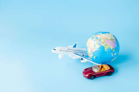 Airplane, car and globe on blue background. Summer or vacation concept. Copy space.