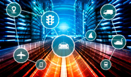 Smart transport technology concept for future car traffic on road . Virtual intelligent system makes digital information analysis to connect data of vehicle on city street . Futuristic innovation .